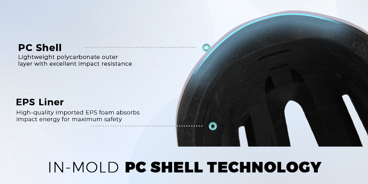 In-mold construction bonds EPS foam to a durable PC shell, providing reliable impact absorption in a lightweight design.