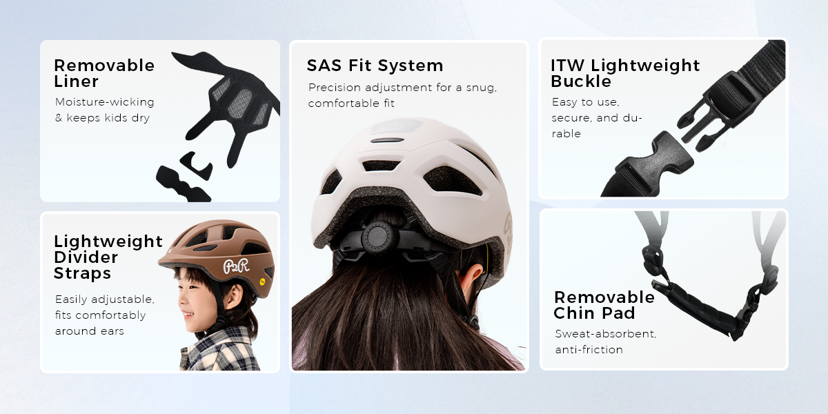 Built for young riders, with a removable moisture-wicking liner, an easy-adjust SAS Fit System, lightweight straps, a durable ITW buckle, and a chin pad that adds both comfort and hygiene.